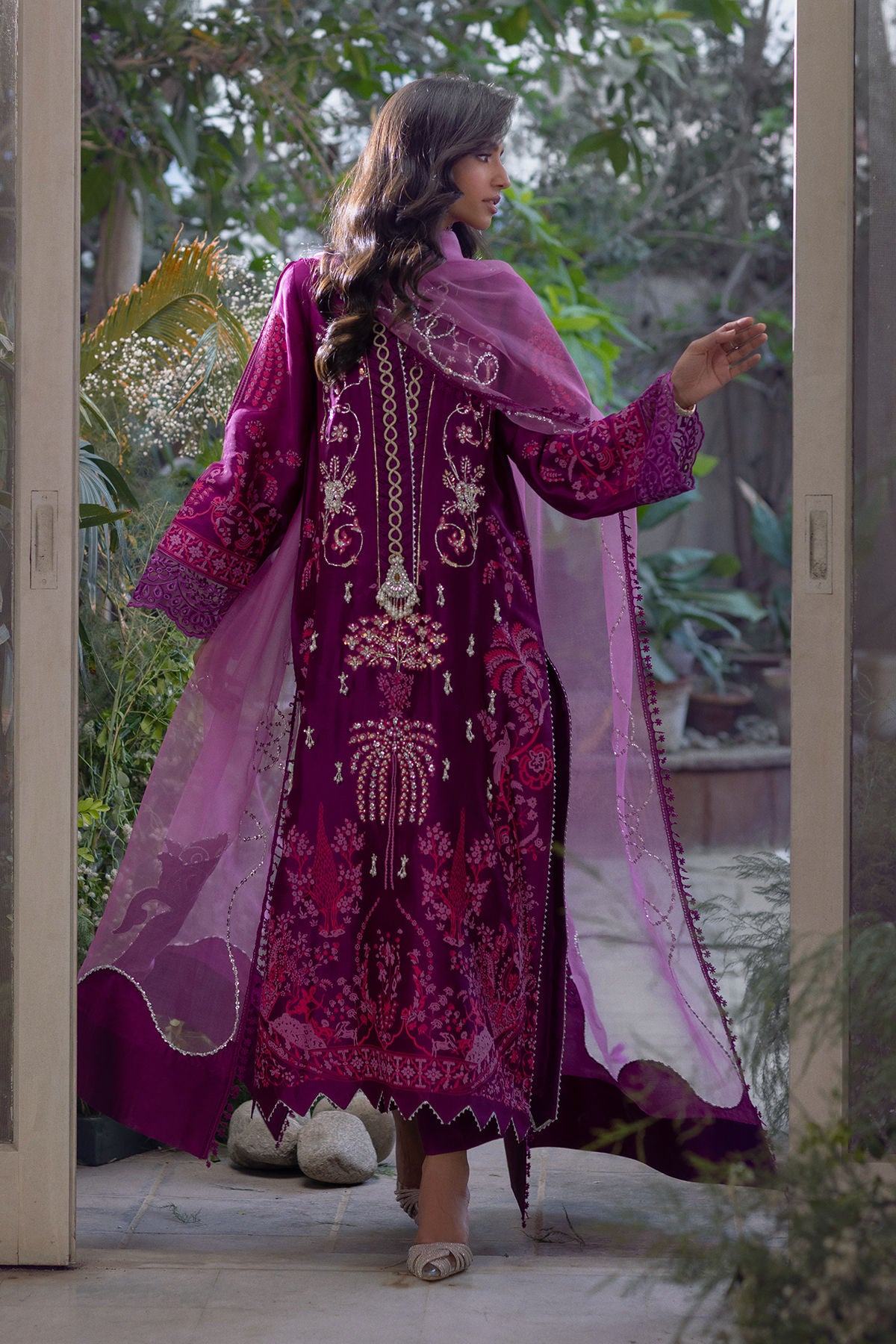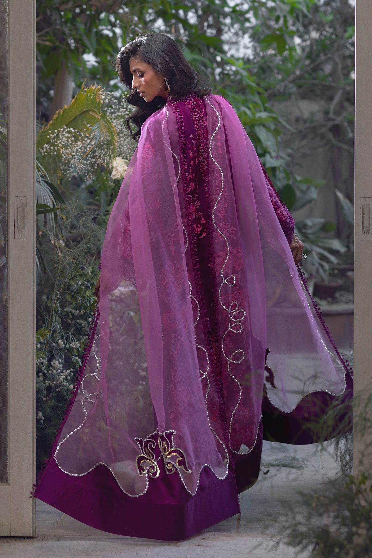 A luminous cranberry-hued A-line shirt, accentuated with tone-on-tone screen-printed floral bloom painterly details, evokes a sense of timeless elegance. The floral embellishments are further enhanced with handcrafted zardozi details in silver. The overlapping neckline is elevated through intricate fabric manipulation techniques. The hemline is adorned with triangle origami details. This shirt is elegantly paired with a statement appliqué dupatta featuring meticulously hand-embroidered borders. Additionally, the shirt may be complemented with straight matching raw silk pants.