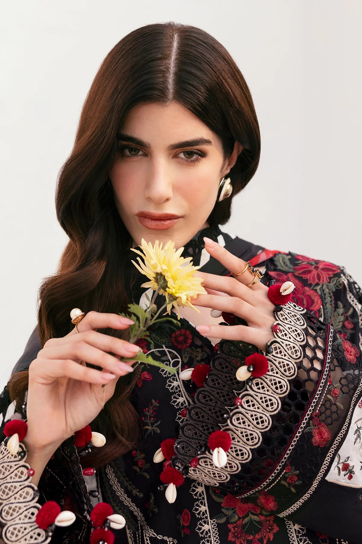 Bold and beautiful, this schiffli outfit is a statement of traditional craftsmanship blended with contemporary design. The black self-jacquard lawn is embellished with vibrant floral embroidery, providing a striking contrast. Organza borders and detailed motifs enhance the richness of the design, while the digital printed silk dupatta adds a layer of complexity with its lush floral patterns, making it perfect for Eid celebrations and evening events.