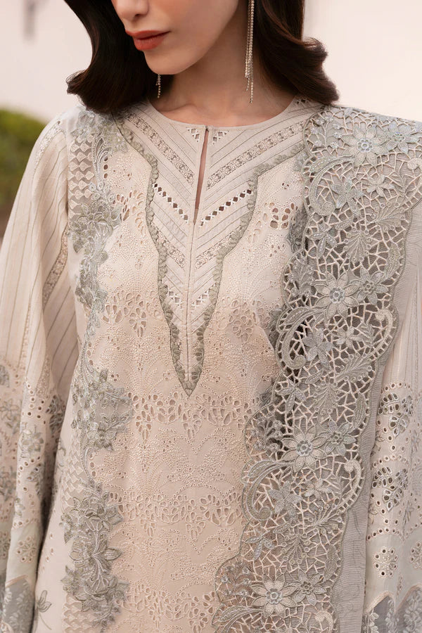 This schiffli outfit exudes a soft, dreamy vibe with its creamy tones and subtle mint highlights. Embroidered self-jacquard panels and borders meld to create a visually captivating display, enhanced further by the delicately printed silk dupatta. The entire look is a testament to understated elegance, perfect for Eid gatherings.