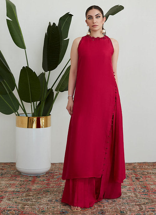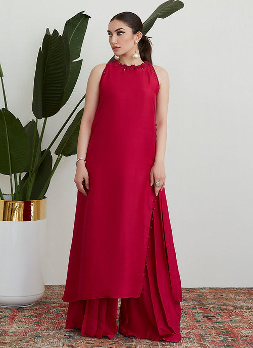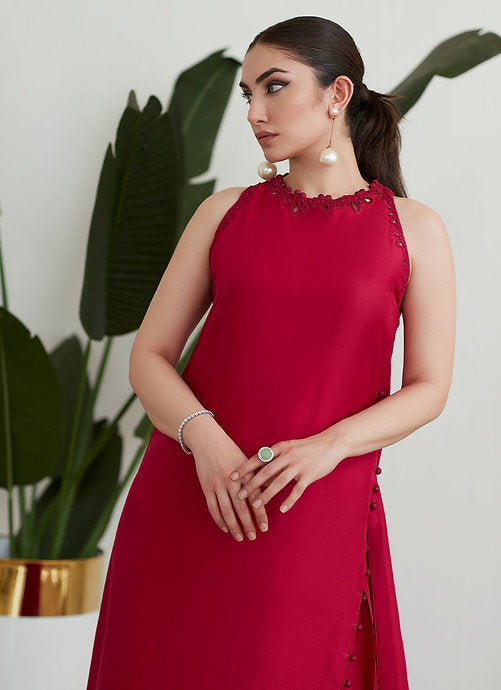 Cut from pure raw silk in a fiery scarlet hue the impeccable tailoring and sleek lines of this ensemble will have you reaching for it whenever you really want to make an impact!