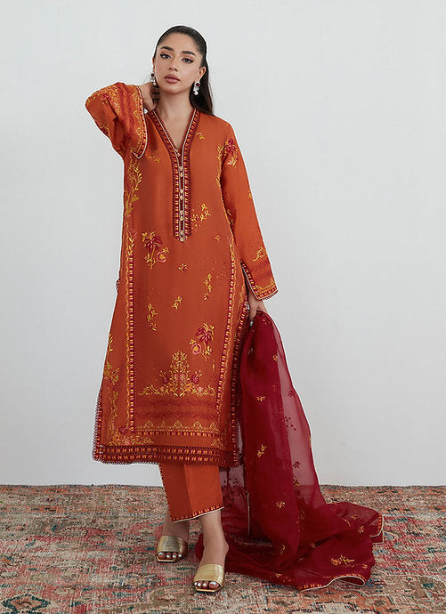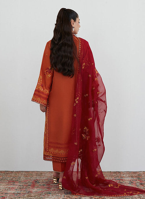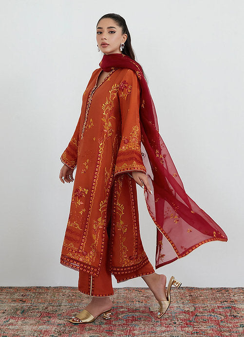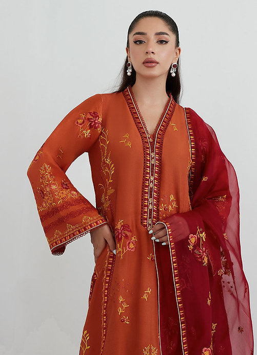 A deep shade of burnt orange raw silk is adorned with stunning composed embroidery all over the front, back and sleeves in shades of off-white, olive green and red.