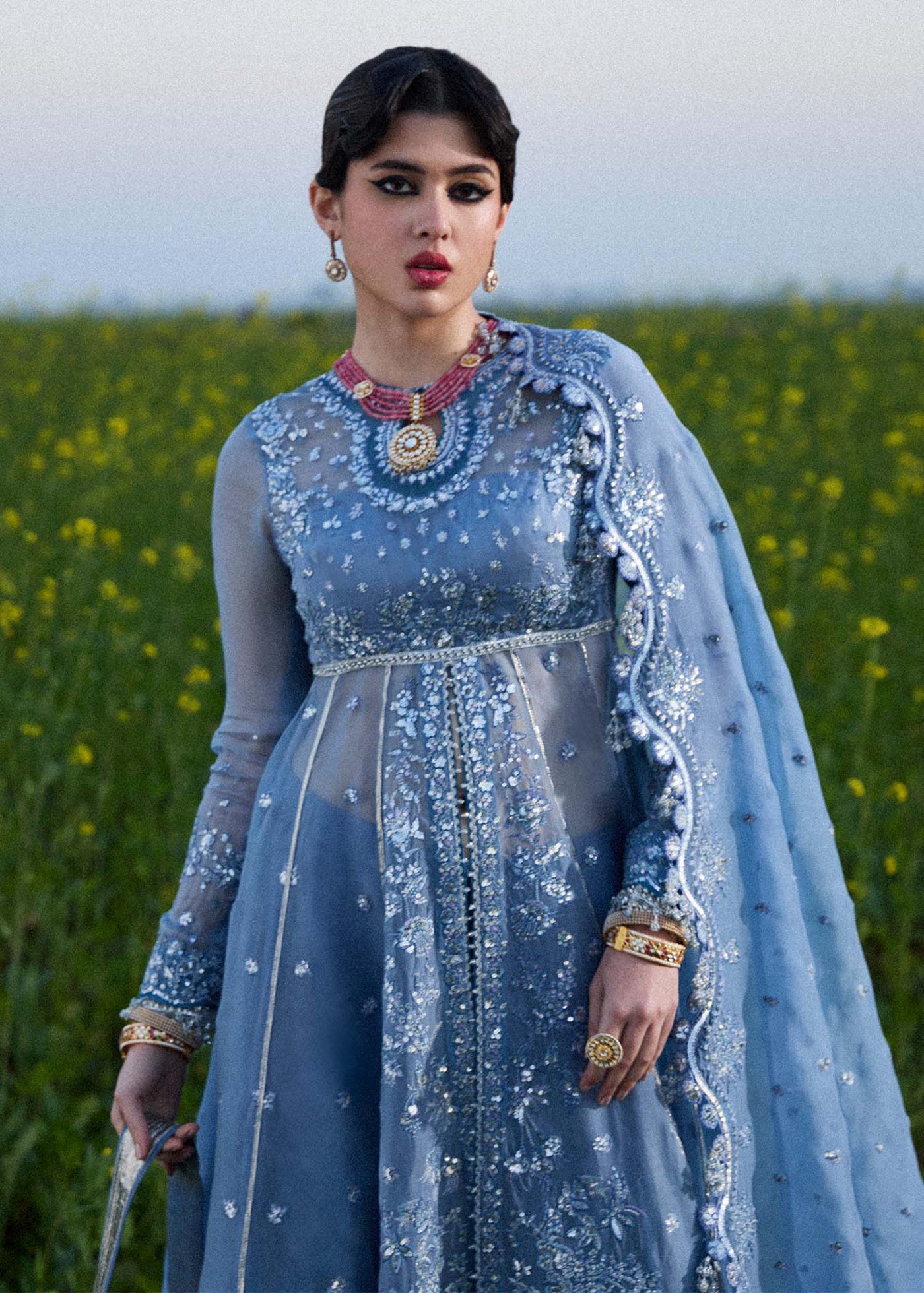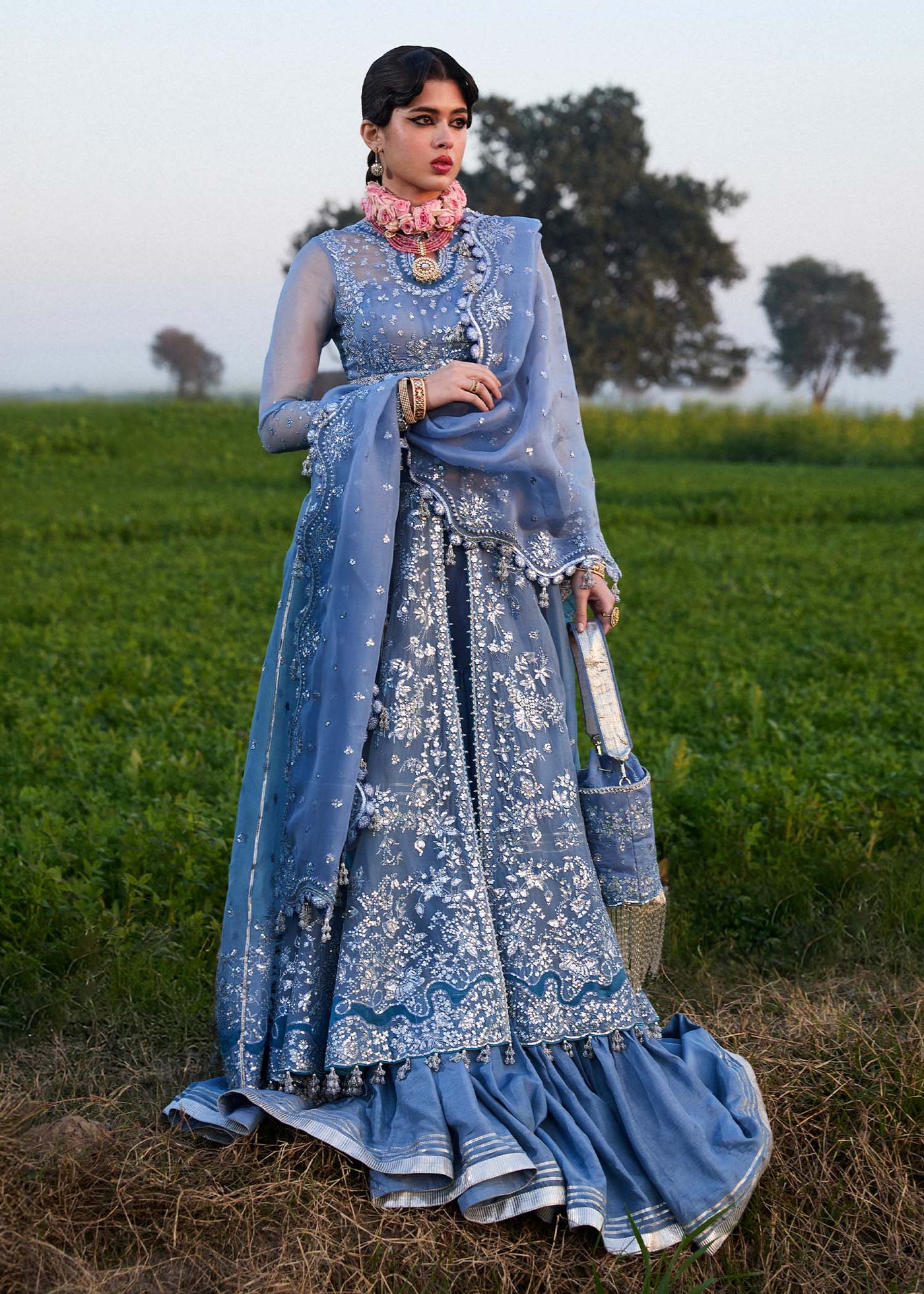 It's a front open organza peshwas. The choli and sleeves are embroidered, and attached with embroidered panels. This peshwas is paired with Korean Raw-silk sharara, which adds a traditional touch. And the dupatta is made of organza with embroidered four side borders, giving it sophistication. This outfit is definitely a head-turner and perfect for any special occasion or event.