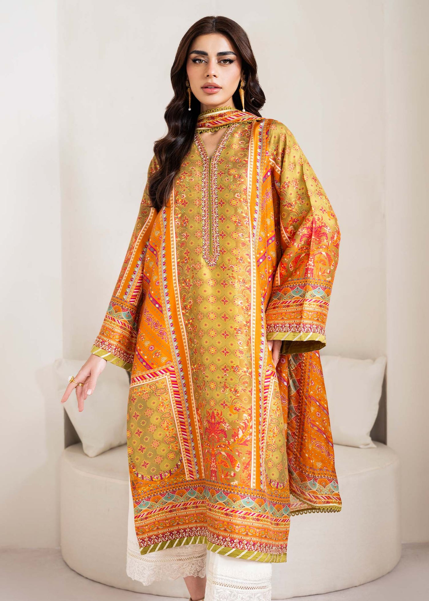 Delicate and timeless, this Two-Piece Pure Raw Silk Ensemble is a soft symphony of pastels and elegance. The design features a soothing combination of blush pink, mint green, and powder blue floral patterns, giving it a refreshing and graceful aesthetic. The shirt is adorned with intricate embroidery along the neckline, sleeves, and hem, further enhanced with shimmering diamanté embellishments that add just the right amount of sparkle. Paired with matching embroidered trousers and a coordinating dupatta, this look is perfect for day-time events and Eid festivities..
